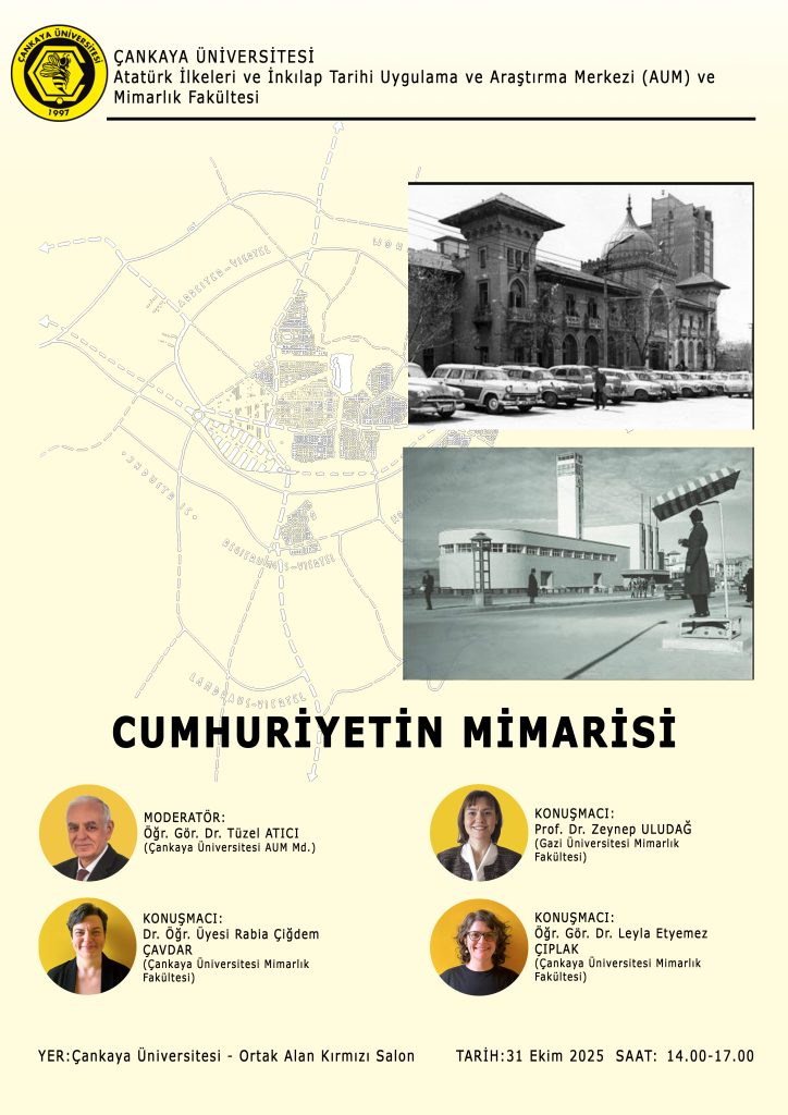 Atatürk İlkeleri ve İnkilap Tarihi Uygulama ve Araştırma Merkezi (AUM) ve Çankaya Üniversitesi Mimarlık Fakültesi işbirliği ile 31 Ekim 2025 Saat 14:00-17:00 aralığında Çankaya Üniversitesi Ortak Alan / Kırmızı Salonda gerçekleştirilecek “Cumhuriyetin Mimarisi” etkinliğin afişi ektedir.